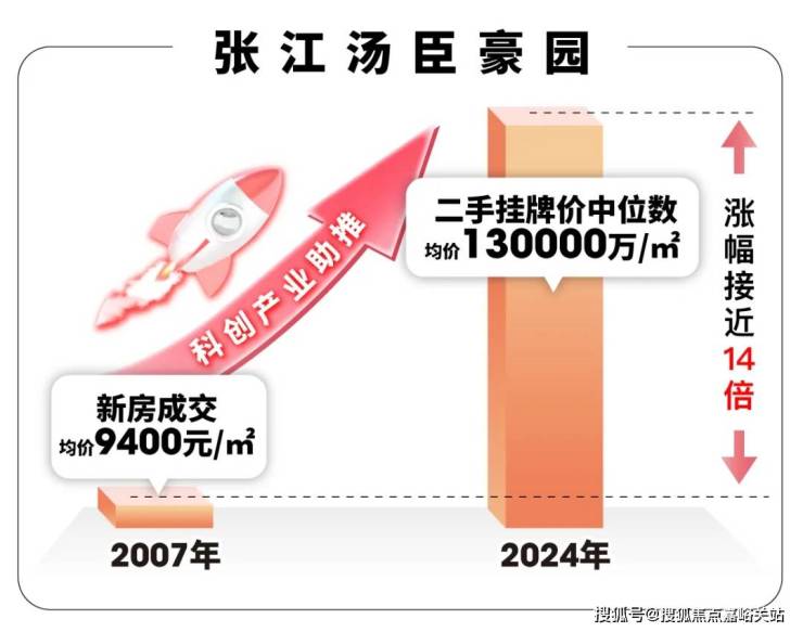 以张江为例:早在2007年,张江板块的品质小区汤臣豪园新房成交均价仅9.4千/㎡,如今该小区二手房挂牌价中位数超过13万/㎡,涨幅接近14倍,远超大盘平均涨幅!