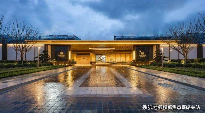 “绮丽门庭”酒店式社区入口,设环岛落客区,高定入户大堂,设飘顶弧形雨棚,顶部采用香槟金色的斜角造型吊顶,招商时代潮派售楼处电话:400--8824--258搭配手工打磨的璀璨星空顶及氛围灯,地面铺设仿石砖,墙面基调则借鉴了华尔道夫酒店的浅米黄色系大理石,并配以精致的礼仪灯设计。