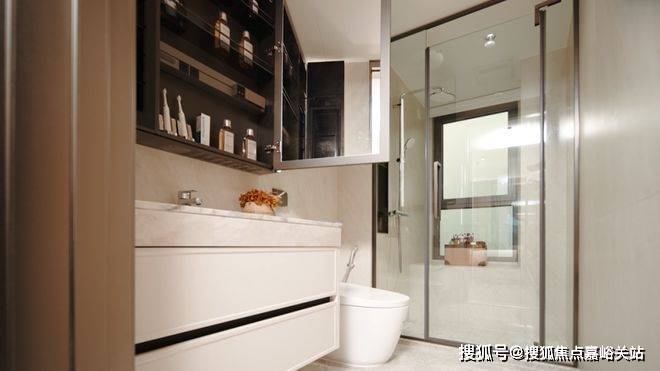 三段式分离设计卫生间,大大提升了使用效率。台盆柜台面为大花白天然大理石;镜柜通高,招商时代潮派售楼处电话:400--8824--258内部设计了铝合金美妆架,便于分类存放物品,随手取放风筒架+柜内插座,让你的吹风筒不再无家可归;并同时配备了美妆冰箱,采用360°循环风冷+自蒸发设计,贴心守护女主人的美妆护肤用品,收纳空间充足。