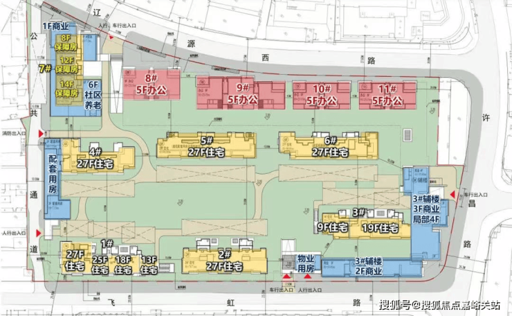 其中,1#为18F+20F层的纯高层、2#为6层的多层+11层小高层+17层高层,3#为6层多层、4#为18层小高层、5#为12层小高层+20层高层,6#为15层高层,7#为8层的保障房。