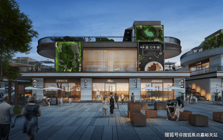 建筑形态上采取了层层退台的设计,以双层开放空间打造街区形态及大片绿化景观,营造出轻松、绿色且充满现代感的休闲氛围。