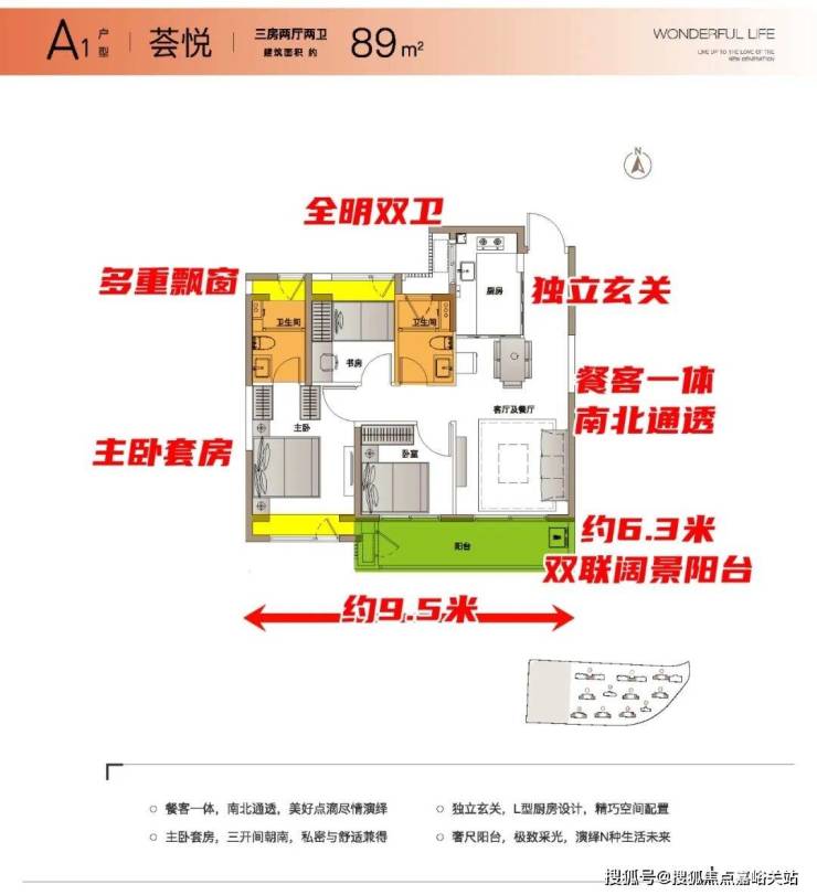 户型:约89㎡三房双卫,约6米双联阳台,尺度拉爆同级产品