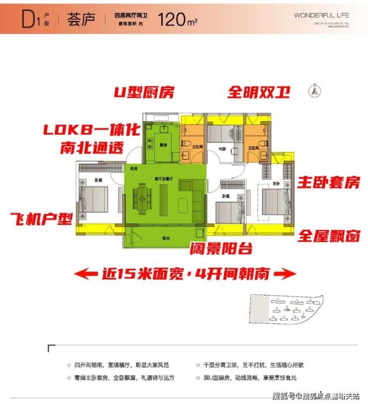 以四开间朝南、宽境横厅、飞机户型、奢阔主卧套房、U型大厨房、全卧飘窗等亮点,满足多孩家庭或改善型客户对空间与品质的双重期待。
