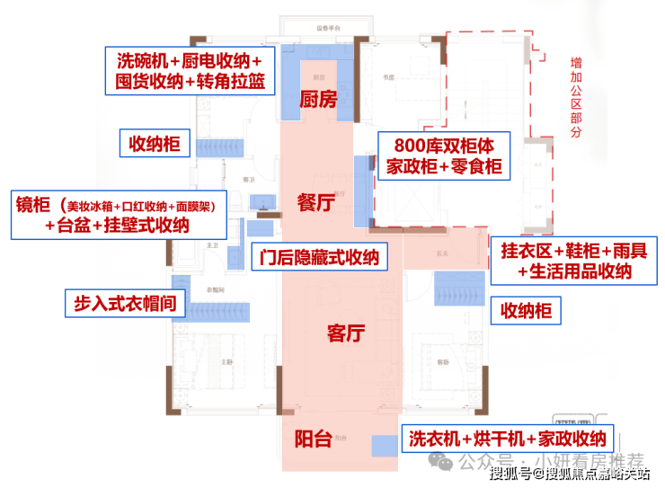 1、精细化收纳系统:全场景收纳,卫生间镜柜内含美妆冰箱、房门后有家政收纳空间、厨房的小家电区、衣帽柜收纳等等,这些一起解决了家庭的大部分收纳问题。