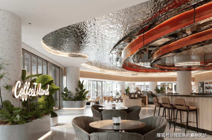 进入营销中心,更能体会空间美学: 挑高8米的大堂搭配银色水波纹天花,宛如时间的涟漪,与绿植相互映衬,为空间增添了灵动感和节奏感,营造出充满未来感的艺术氛围。