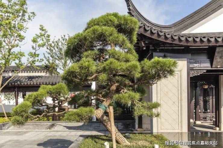 门口以百万黑松迎宾,彰显仪态万千,又选取了硕大的湖石平躺在照壁之下,与黑松相得益彰。借鉴四大园林中的 “狮子林”布局门户,寓以照壁、松、石,体现居者的身份与贵气。