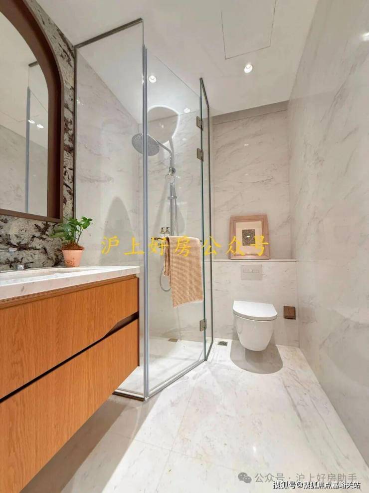 基础硬件都不差,项目在审美上还做了不少创新——☑️☑️外滩源著复兴里售楼处电话:400-1183-605☑️☑️卫生间大量采用奢石和石材,比如主卫柜体墙面就是香格里拉翡翠拼花,龙头是冷热分离式,成本更高: