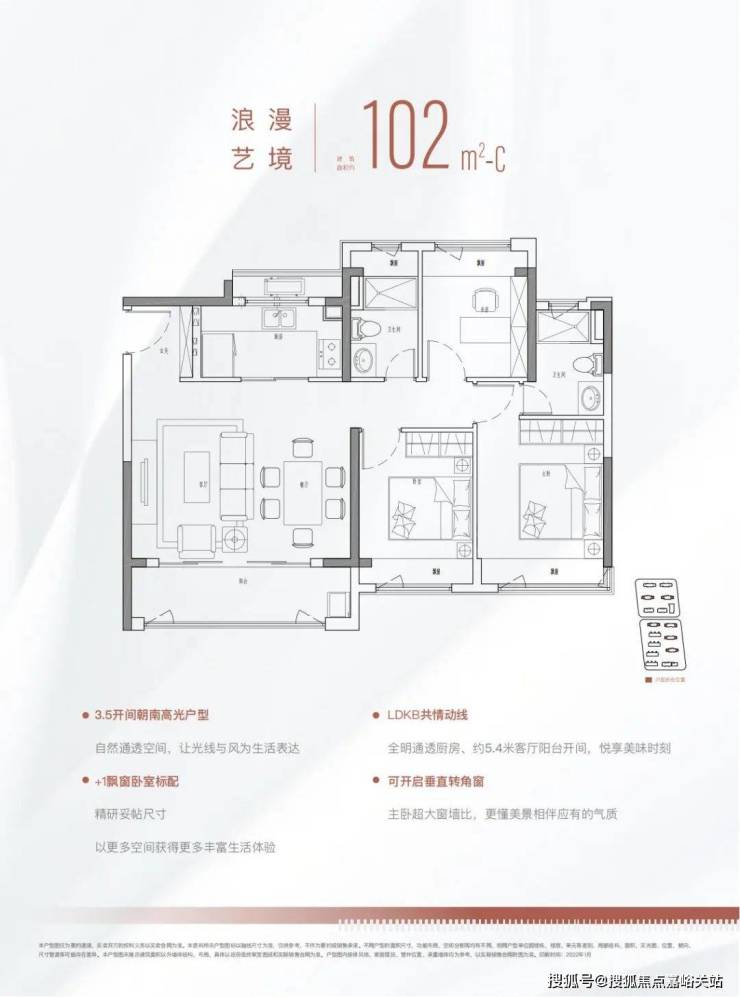 102㎡三房两厅两卫的舒适户型,约5.4m横厅设计,3.5开间朝南,得房率约80%左右(*该得房率仅供参考,最终以开发商官方数据为准);每间房均有飘窗,全屋飘窗共享有额外的面积约13㎡(*此处面积仅供参考,最终以开发商官方数据为准)在市场上也是少有的产品。