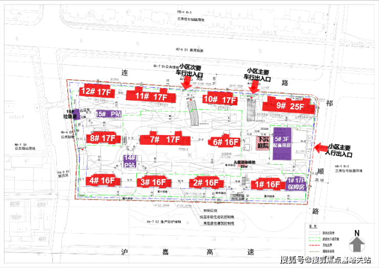 其中1号楼靠近17层的保障房,5号口为3层的配套用房;14#、15#为P站,16#为垃圾用房。
