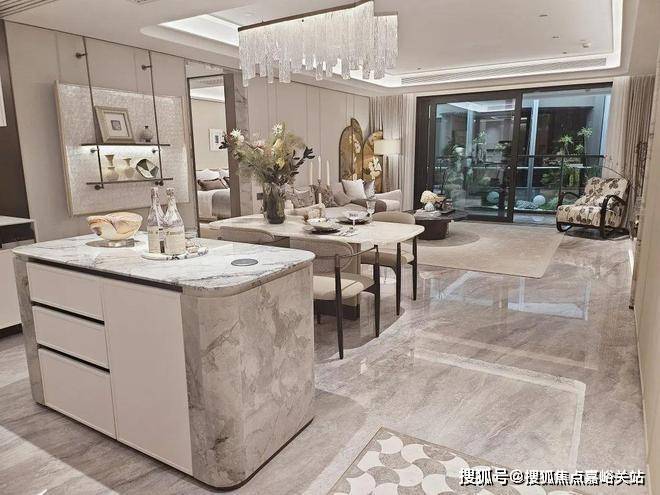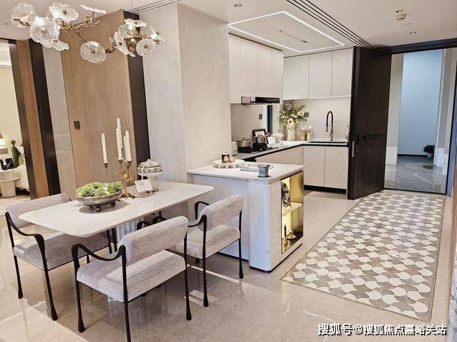 柜门白色烤漆面板,抽屉分区也都是帮大家细致划分,如多功能调味拉篮+谷物抽+碗碟拉篮等。岛台上配置可升降插座,铝合金抽屉,海上清和玺售楼处电话➡☎:400 - 8824 - 258【24小时预约快线】石材背景板的金属开放格实用性很强。