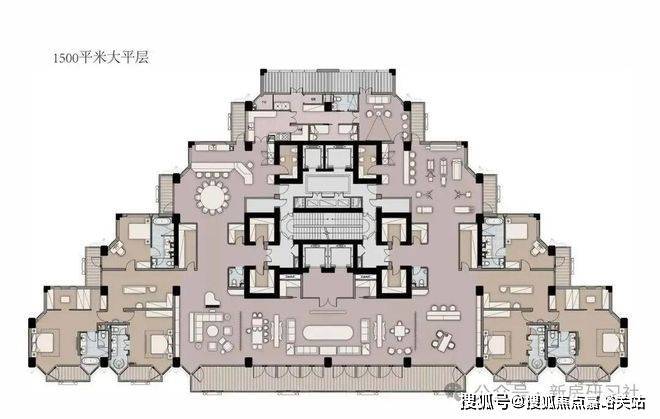最豪气的还是这个整层一户 建面约1500㎡的大平层户型。它南向面宽达60米,有14个阳台!