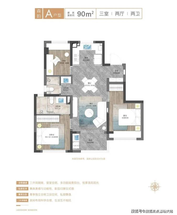 建面约90㎡三房,经典飞机户型,南北通透,餐客厅一体,减少空间浪费