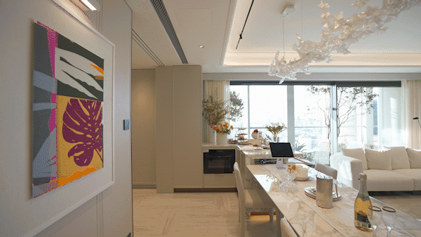 另外,因为豪宅客户对于精装美学有自己的审美,所以此次项目提供了超越行业的三大柔性定制——艺术家联名定制入户门把手、艺术家联名定制艺术门牌挂画以及墙面饰面&岛台等区域提供多款石材/岩板款式。