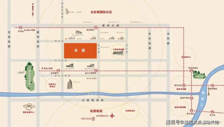 本项目西侧是嘉闵高架路,它是上海除南北高架外的另一条南北主干线,与其他三横线:曹安公路、京沪高速、沪嘉高速,三纵线:外环高速、中环高架路、沈海高速形成了三横三纵的立体式交通网络,对内地铁可快速连接静安寺、新天地、人民广场等核心商圈,对外驾车可无缝对接市外各个交通网络,驾车到虹桥交通枢纽(机场及高铁)约15到20分钟。