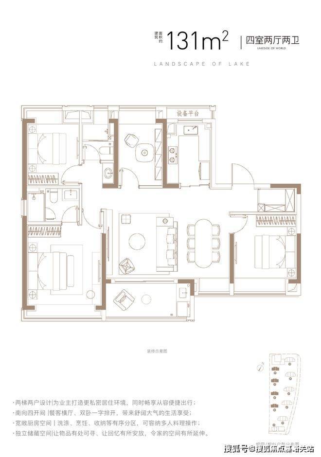 建面约131㎡4房2厅2卫,两梯两户设计,给足了业主归家仪式感和尊崇感,同时拥有一个尺度阔绰的入户门厅作为自己家的延伸!
