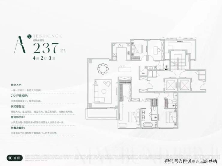 10#总高13F,户型为建面约199-236㎡4房2厅3卫,两梯两户,层高约3.15米。