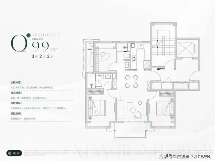 建面约99㎡ 3房2厅2卫: 一梯两户,层高3.05米,经典飞机式户型;LDK一体化,南北直通,全卧飘窗,南向整体面宽约9.9米,其中客厅面宽约3.6米,主卧面宽约3.3米!