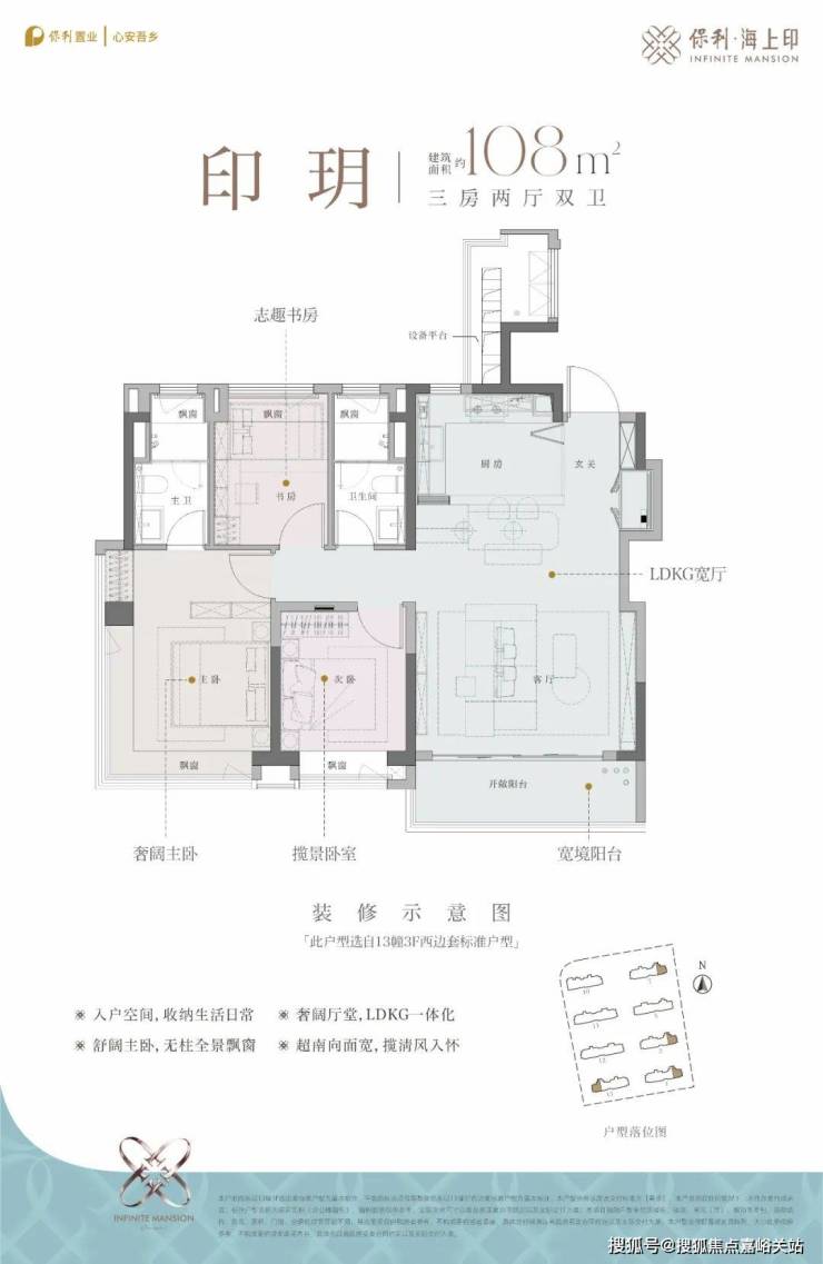建面约108㎡3房2厅2卫,该户型为经典的动静分离户型,三开间朝南,预留分户S墙设计,客厅面宽约4.85米,边套户型主卧为270°转角飘窗!