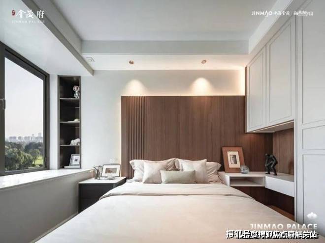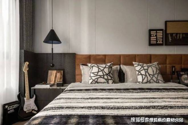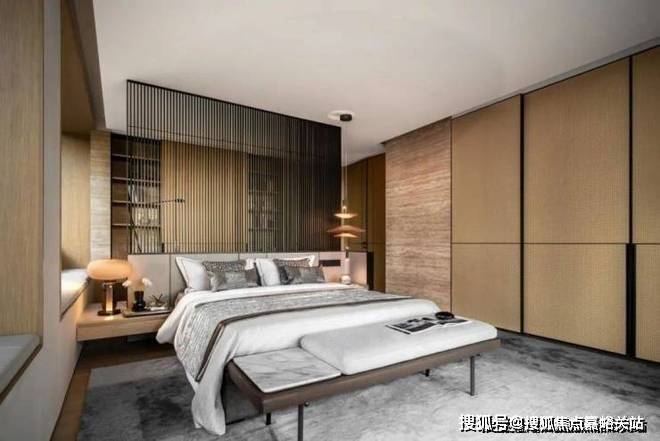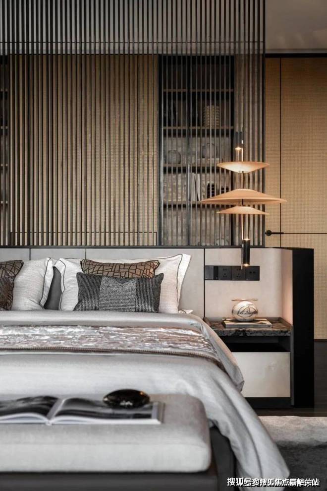 建面约107㎡科技样板房主卧背景墙采用皮革硬包,更是镶嵌了金属线条,在高端大气的香奈儿风格色调下凸显了温馨的氛围。