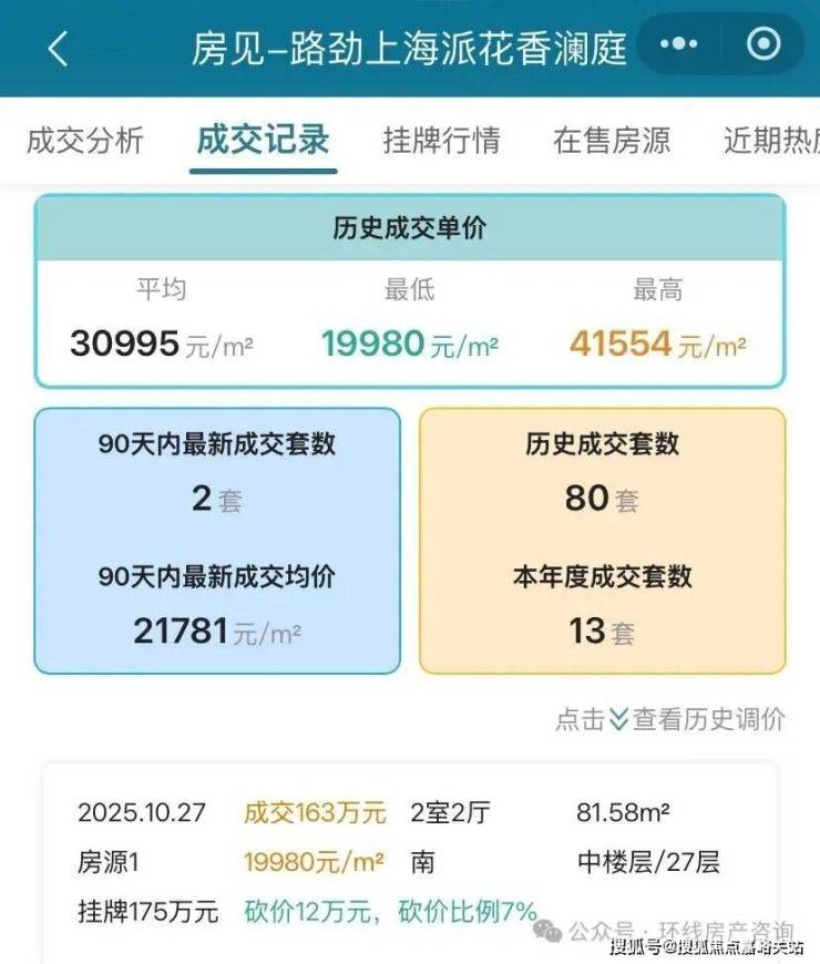 但是现在二手房回调得比较大,以上海派花香澜庭、君悦华庭为例只有2万元/m²,腰斩了: