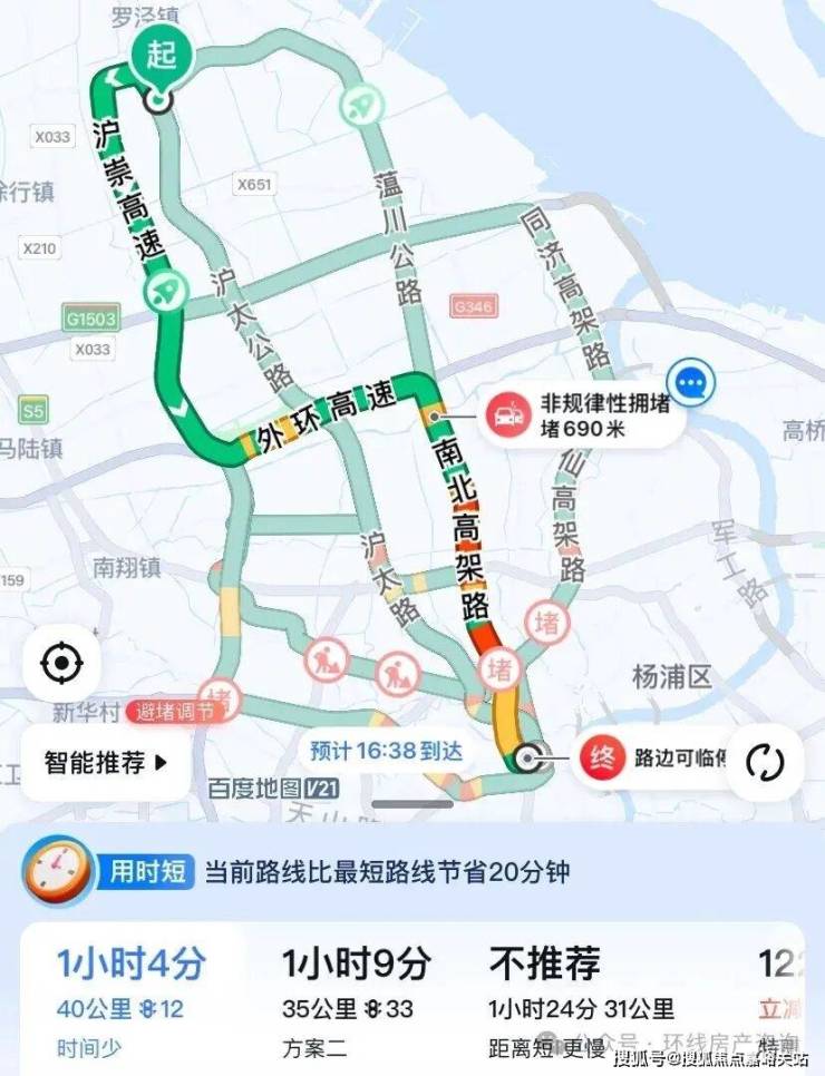 从这里自驾到人广道路并不顺畅,经沪崇高速转外环再转到南北高架要1个小时多,高峰期耗时更久: