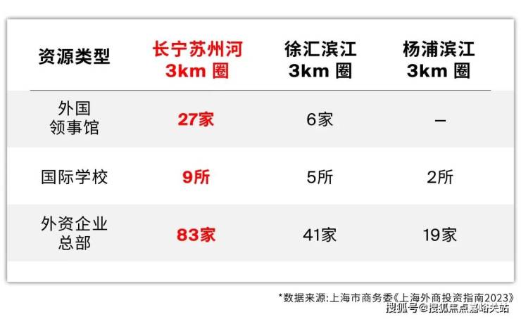 据上海市商务委《上海外商投资指南2023》数据显示,长宁涉外资源密度是徐汇滨江的2-3倍、杨浦滨江的4-10倍,是能够支撑国际客群支付溢价的!