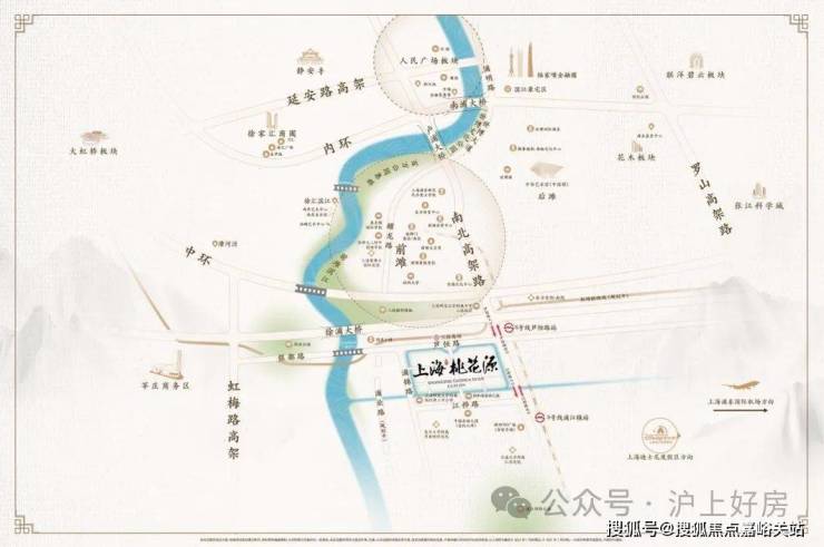 上海桃花源的择址,与传统市中心人民广场在南北中轴线上,由济阳路快速路、中环、外环以及各大隧桥快速连通市区,这是项目出则繁华的基础。