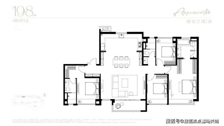 当传统百平户型还在为三开间挣扎, 南山璞缦建面约198㎡以约19米四开间朝南面宽+LDKB一体化纵深实现降维打击。主卧折角飘窗延展空中墅级视野,HWCD团队更将海派摩登融入奢装细节,让室内每一寸空间成为艺术展场。