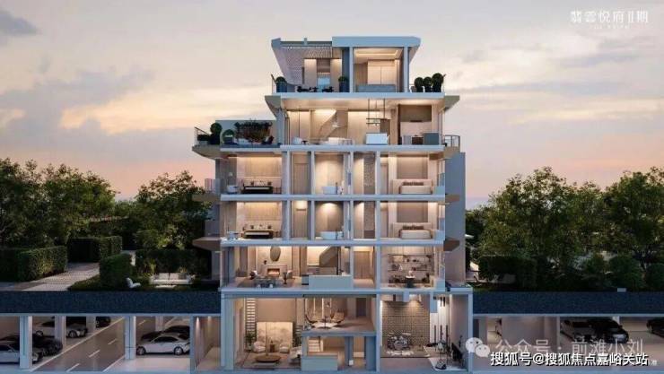 上下纯4层建筑总高, 翡雲悦府·悦墅! 通过大面积水晶玻璃, 以珠宝级工艺重构建筑立面!