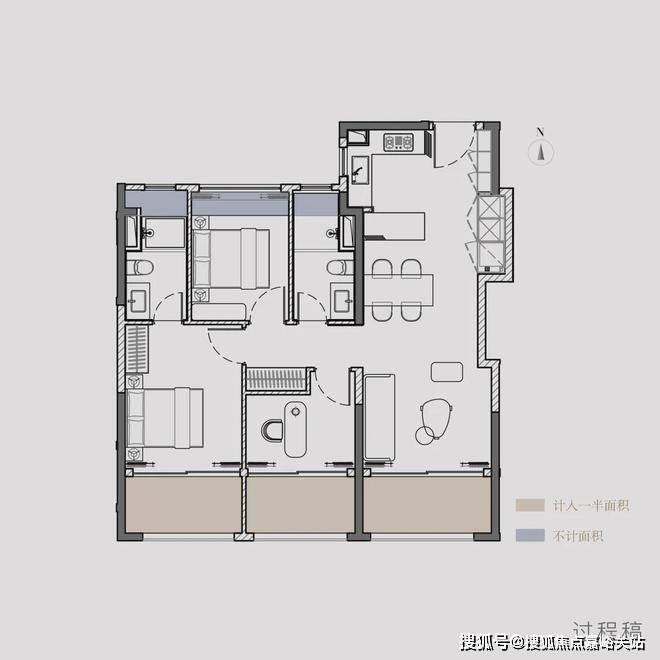 甚至连厨房飘窗都打造成为一面操作台,算下来,户型实得率飙升至约96%!