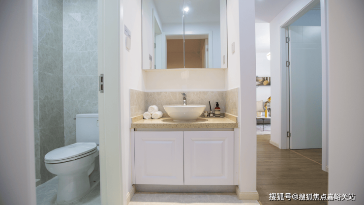 也正是因为一个卫生间,才能做出这样的尺度感。镜柜打开就是收纳空间,整体干湿分离,一边可以洗脸刷牙,一边可以上厕所,尽可能满足多人口使用的需求。即使早上也来得及,三口之家的使用绰绰有余。