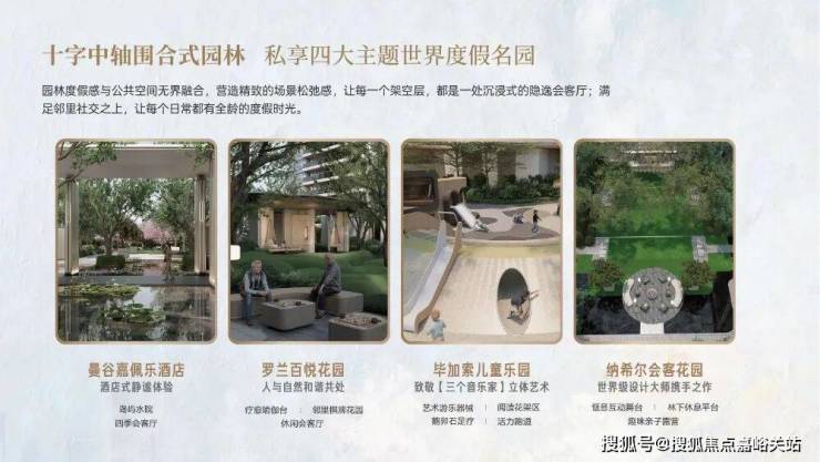 ►围合式花园,四大主题景观,纳希尔会客厅、度假风格水景,艺术与自然交融。