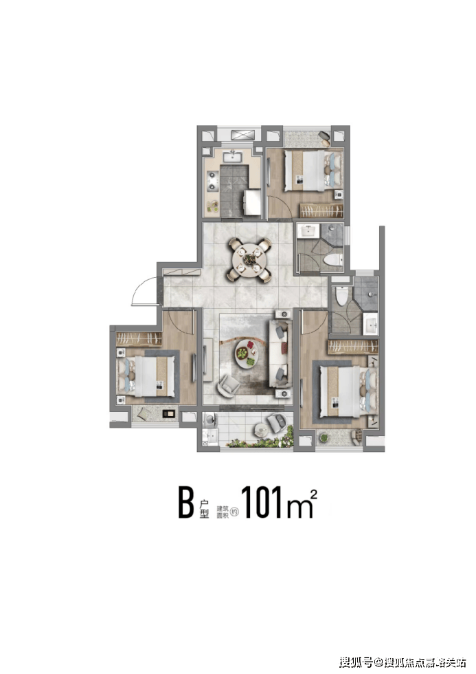 也有建面约113m²舒适性三房,南北通透;飞机户型,房间分列两侧互不打扰;卧室空间也相对更大、更舒适。