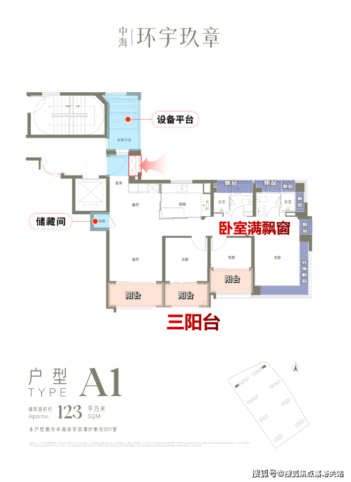 以建面约123㎡户型为例,通过南向三阳台+全赠送飘窗,多享面积接近一间主卧,实际尺度堪比140㎡。