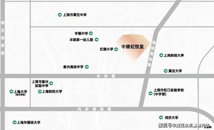 中建·虹悦里位于虹口江湾镇,区位相对不错,虽然地处 中外环间,但是距离 中环线不到1km,南侧中环高架,东侧逸仙路高架,也可以直上内环。