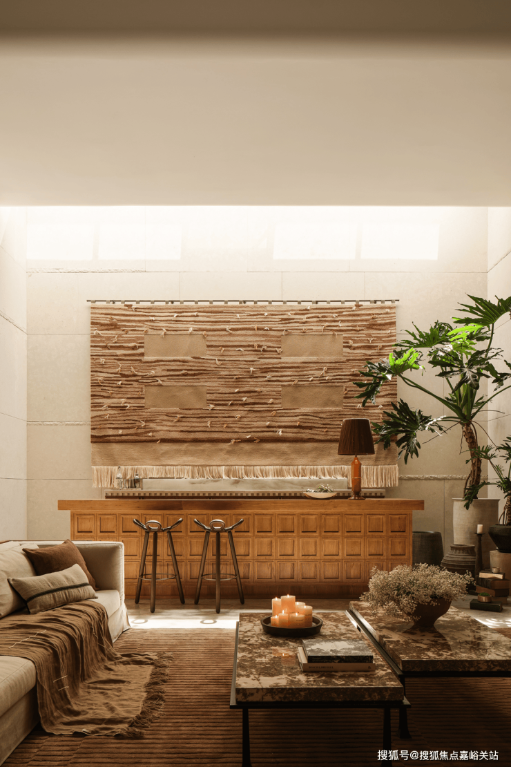 自然洞石的天然纹理与绿植形成“自然性”表达,呼应度假场景中“都市度假”诉求阳光透过窗帘洒入柔和光影,与墙面共同营造疗愈性光环境。