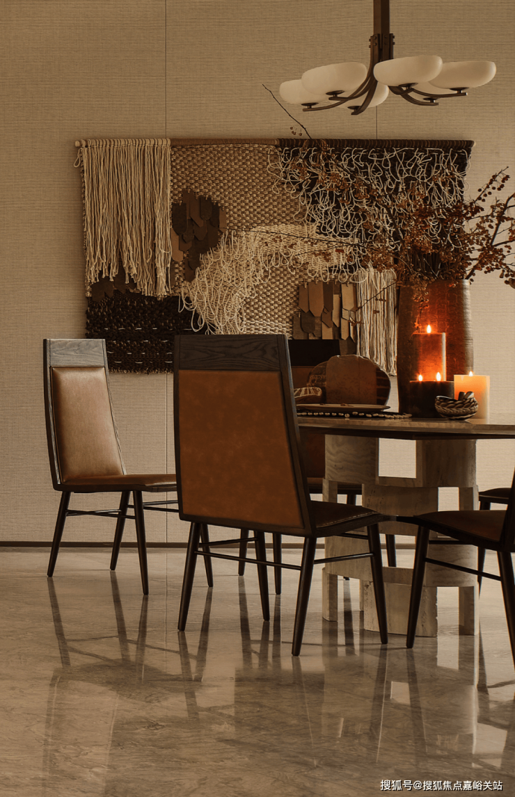 浅色圆桌为视觉中心,烛光、陶碗、红果枝叶聚拢三餐温度,深棕皮质座椅围合出家人闲坐的松弛感。