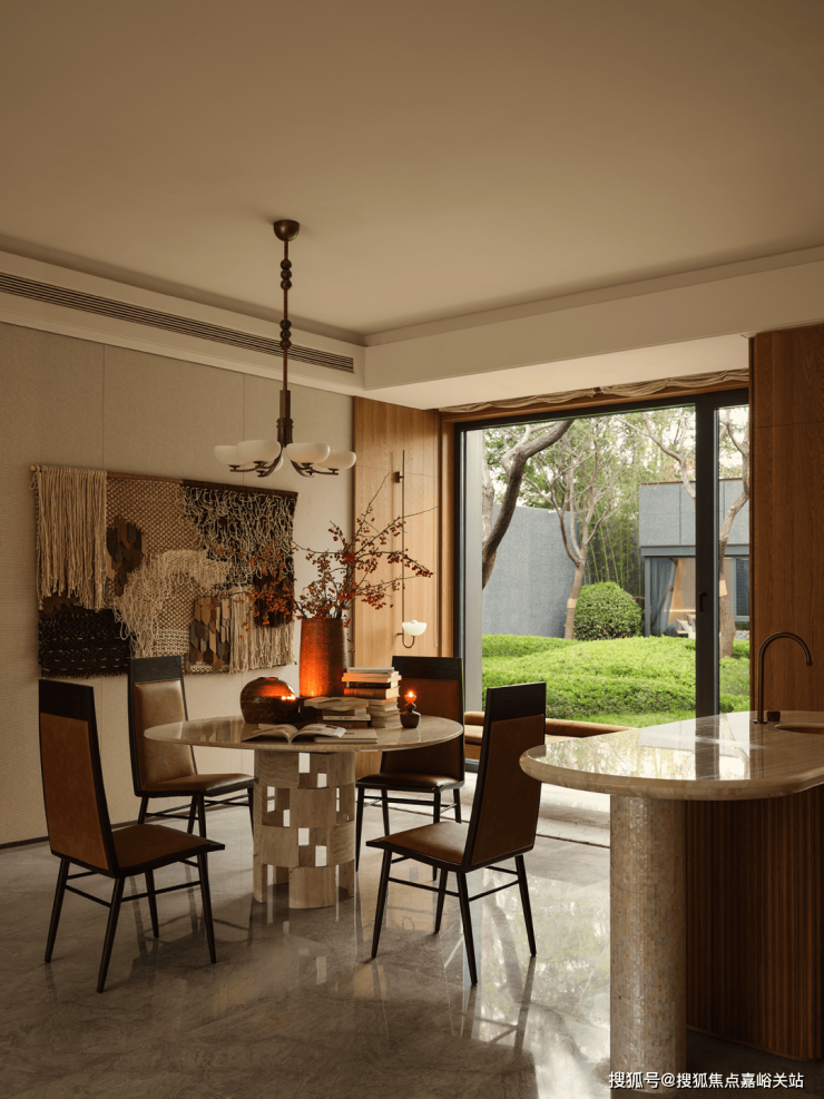 圆形木桌如日晷捕捉第一缕晨光,贝壳吊灯的螺旋曲面将朝霞折射成餐桌上的光斑涟漪。