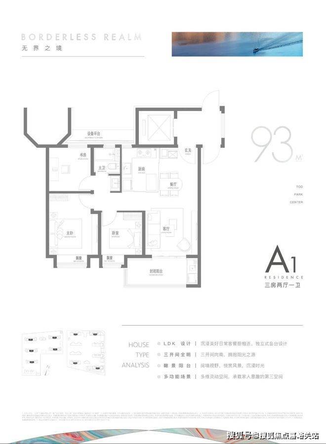 建面约95m²户型特点: 开放式厨房,极度释放厨房与客厅的尺度与互动可能,无连廊设计,一梯两户极致梯户比,南北通透舒适感