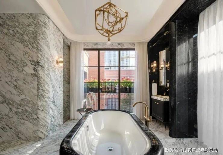 深铜色的栏杆和扶手融合传统与现代语汇,演变出一种当代型态,与现代白色洞石相映成趣,营造出优雅纯粹的意境。