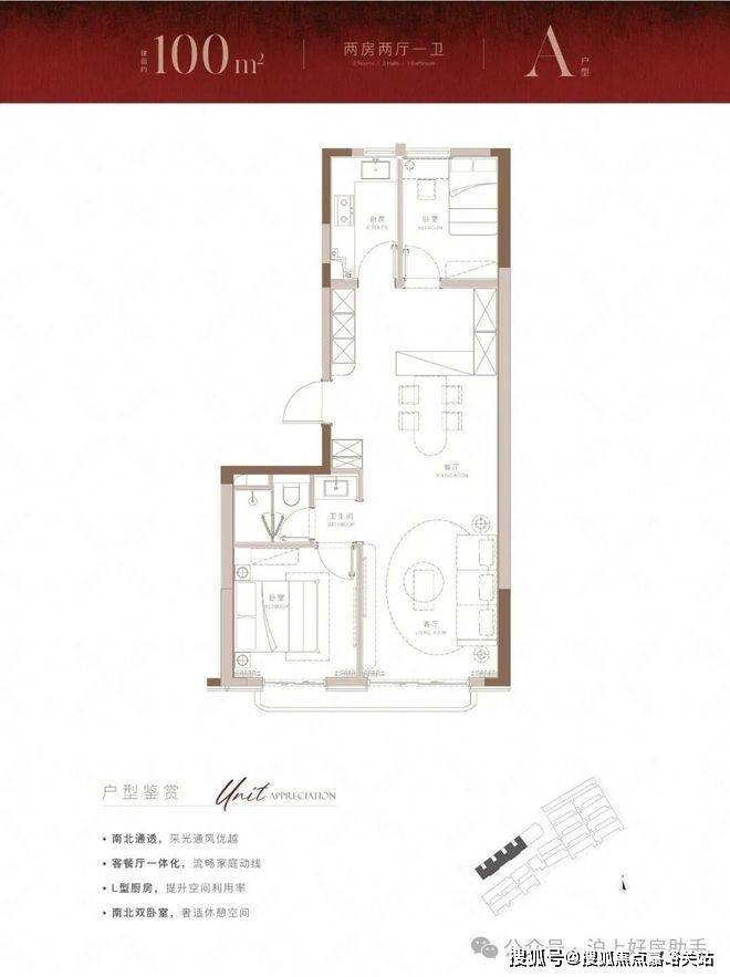 经典的 南北通透房型,卧室客厅采光皆丰沛, 一体化客餐厅带来的不仅是最便捷的烹饪动线,也为家庭成员之间的互动和交流日常提供了舒适空间,再加之 南北双卧设计,也保证了足够的温馨休息场地。