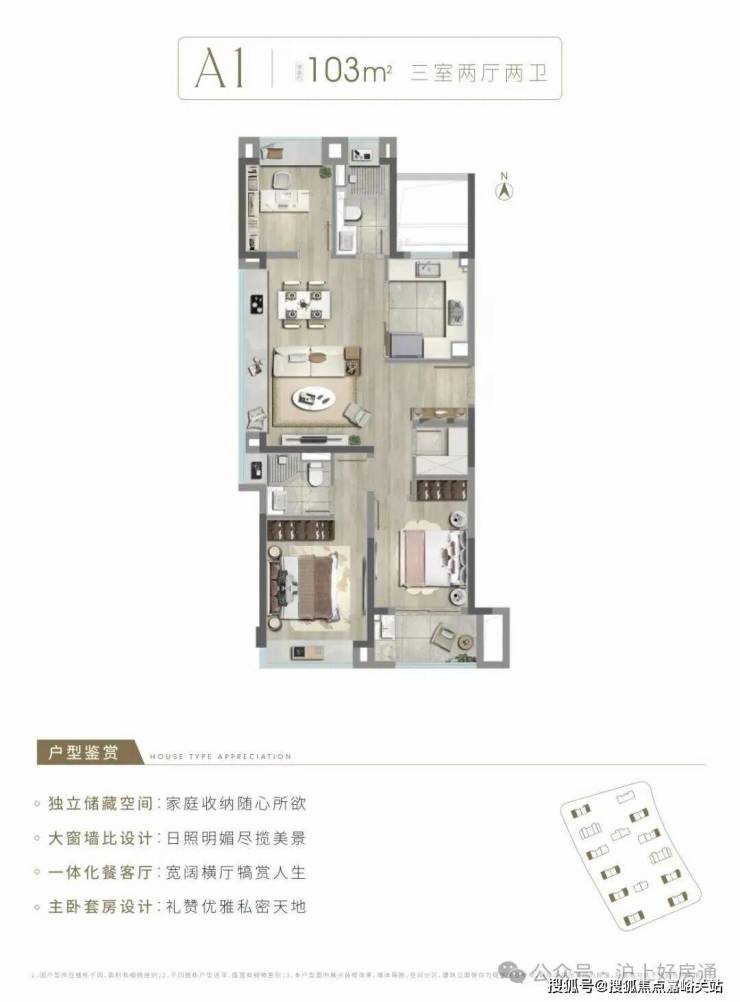 做到了三个面采光+双开间朝南+主卧套房设计+南北通透,室内通透明亮。