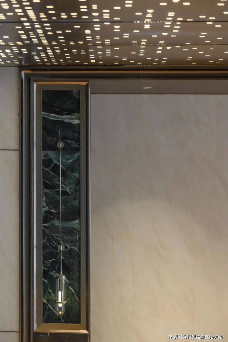 架空层入户门厅处,以普拉达绿奢石为背景装饰,提升了整体空间的质感,结合金属铝板装饰搭配,归家仪式感满满。