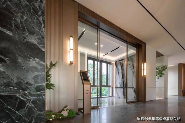 雅奢酒店式的入户大堂,巴西银河星空奢石景墙与入口仪式水景,将闲适的生活体验与高品质的追求融合一体。