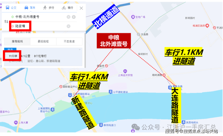 自驾上,项目往北约300米就是北横通道,往南车行约1公里,就是新建路隧道和大连路隧道直达浦东。从项目到陆家嘴、北外滩和外滩都在10分钟左右。
