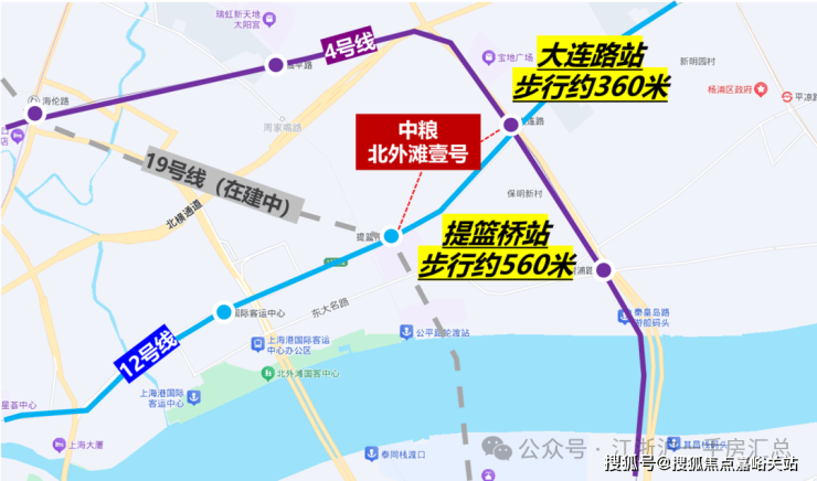 交通方面: 项目周围环绕三条地铁,步行约360米到4、12号线大连路站,步行约560米到12、19号线(在建)提篮桥站。
