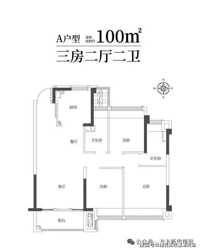 建筑面积约100㎡雅致三房两卫,满足二娃时代