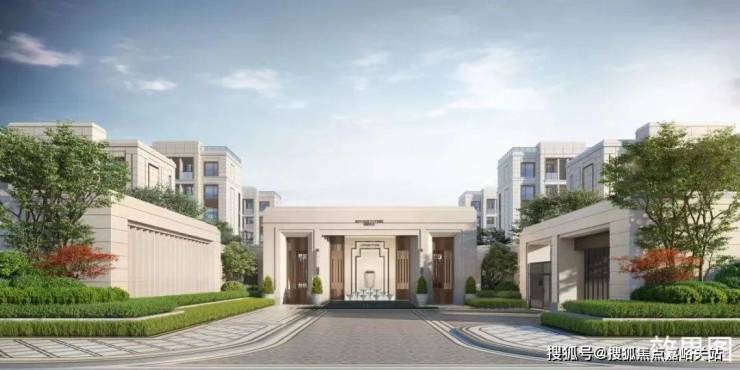 小区入口以“U型围合式空间”配合酒店式入户大门,打造五星级归家体验,门口设计了酒店式水景落客区,便利业主打车或临时停车的同时,也彰显了高品质精致生活。