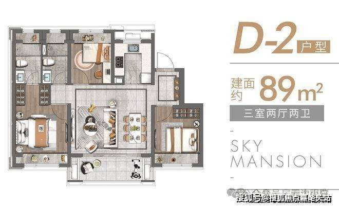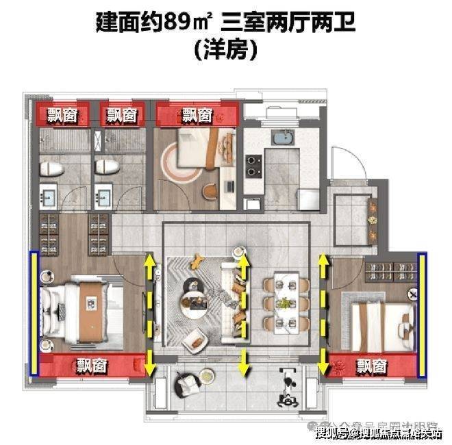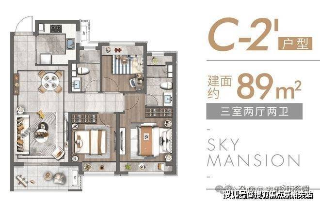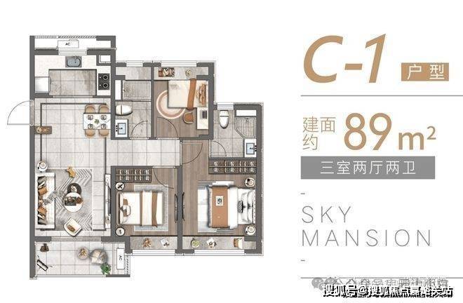 除了建面约89㎡的洋房, 建面约83~89㎡高层户型也各有所长,均是三房设计,无论是从结构布局,还是空间利用皆相得益彰,承载一家人的美好生活。 高层户型如下: