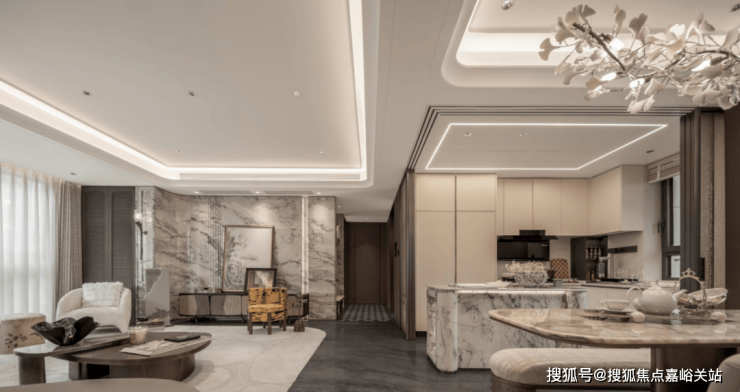 【海上·清和玺】空间采用奢材定制,将品质延续到每个细节中。门庭延街的外立面,以精工定制弧形贝金米黄大理石为主调,镶嵌典藏级老虎玉大理石,点缀古铜色现代海派艺术感灯器。整体呈现一种流转于百年海派的贵雅气质。
